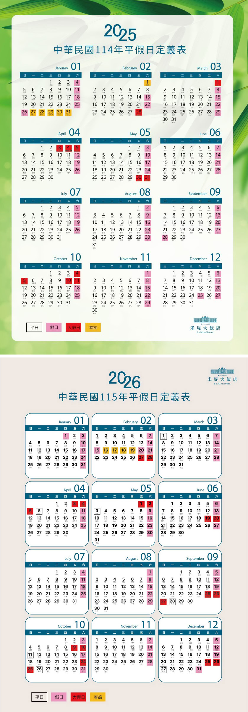 - 假日(週六)每房每日加價NT$ 1,800 元/房,連續假日及大假日每房加價NT$ 2,300 元 /房。